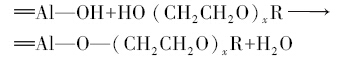 圖 1中結果顯示,隨著PEG-1000加入比例的升高,溶液中殘余的Al3+濃度呈現先降低后升高的趨勢.這是由于PEG-1000的加入不僅影響了Al(OH)3沉淀的效率,而且對己形成的粒子的生長速度也有一定的影響.從圖 1中的原液(PL)沉淀后剩余離子濃度的柱狀圖中可以看出,鋁酸鈉溶液中含有少量的Si(含Si物質在各步除雜反應過程中基本不發生反應)、Fe、Ca和Mg雜質,其中Fe、Ca和Mg在沉淀反應前后的濃度基本沒有變化,這與其初始濃度比較低有關.在反應過程中,PEG-1000很容易吸附在快速生成的Al(OH)3的表面,PEG-1000上的羥基可以與顆粒的表面羥基發生作用: