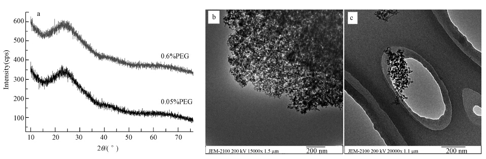 圖 4 Al(OH)3樣品的XRD(a)和TEM分析圖(b. 0.05% PEG;c. 0.6% PEG) Fig.4 XRD(a) and TEM(b. 0.05% PEG; c. 0.6% PEG)analyses of the Al(OH)3 samples