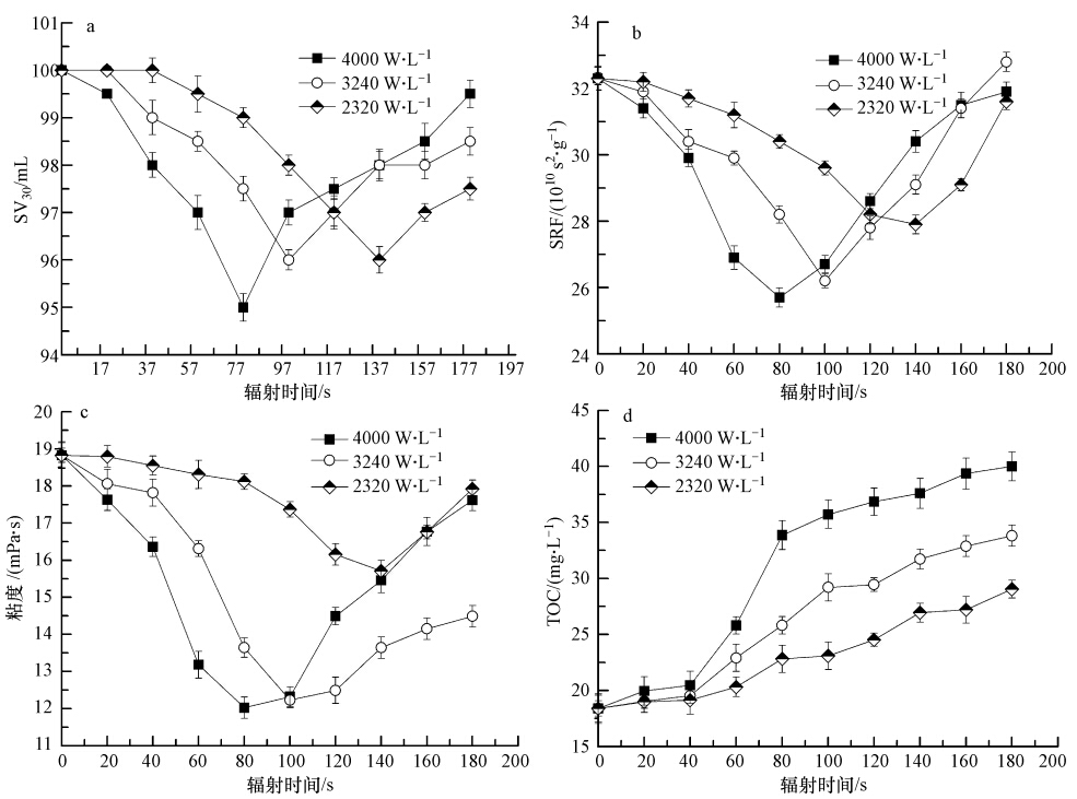 活性污泥中生物絮體構成了懸浮固體的主要成分,可通過測定污泥上清液的TOC值的變化來衡量污泥的破解程度.由圖 1d所示,TOC值隨著微波輻射功率和處理時間的增加而增加,表明污泥絮體被微波破壞,釋放細胞內物質到溶液中.污泥破解的程度取決于微波輻射功率的大小和處理時間的長短. 2320 W · L-1、140 s時,TOC含量從原來的18.39 mg · L-1上升到26.94 mg · L-1. 3240 W · L-1、100 s時,TOC含量上升到29.2 mg · L-1. 4000 W · L-1、80 s時,TOC含量上升到33.87 mg · L-1.隨著輻射時間延長,TOC含量持續上升,但是上升緩慢.對比微波輻射對污泥沉降、過濾性能及粘度的影響研究結果,污泥適宜的破解程度才能改善污泥的脫水性能.