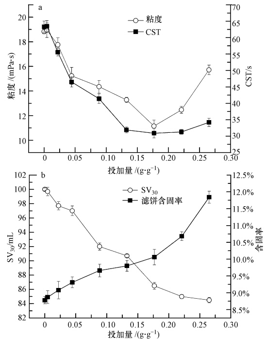 圖 2 高鐵酸鉀投加量對污泥脫水性能的影響(a. 表觀粘度和CST,b. 表觀SV30和濾餅含固率)