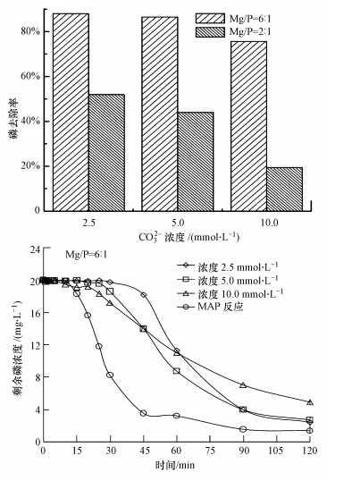 表1 不同CO2-3濃度下P和Mg的去除情況(n(Mg)/n(P)=6 : 1)