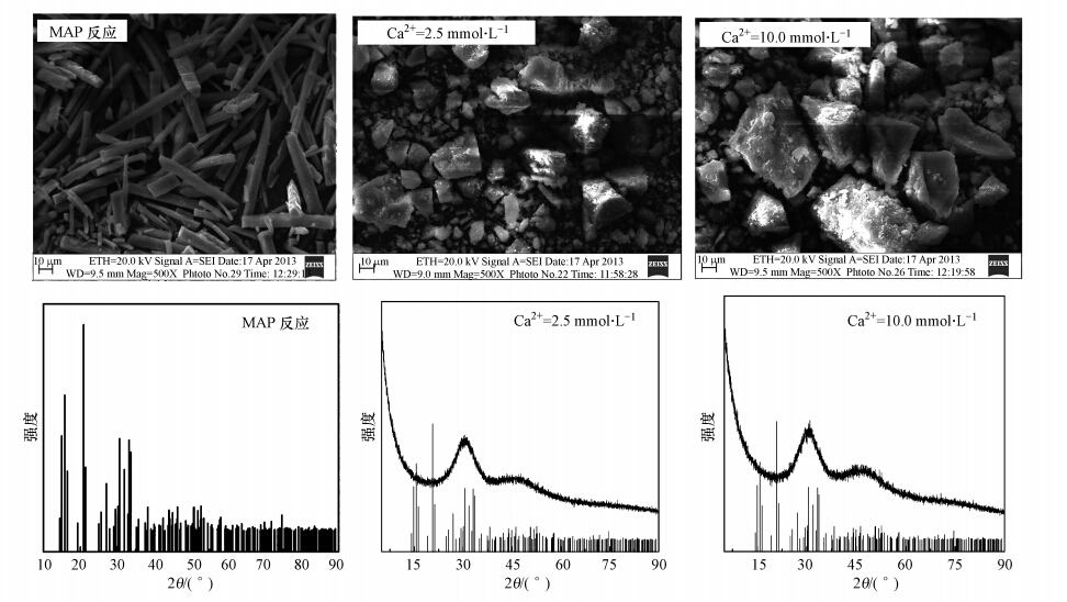通過對(duì)沉淀產(chǎn)物的SEM照片(圖 8)分析可知,沉淀產(chǎn)物并非針狀而是塊狀,初步判斷產(chǎn)物為磷酸鈣鹽.對(duì)產(chǎn)物進(jìn)行XRD分析(圖 8),其分析結(jié)果證實(shí)了上述判斷,圖譜中沒有MAP晶體的對(duì)應(yīng)峰,而是無定形磷酸鈣圖譜.HAP的Ksp(4.7×10-55.9)比MAP的Ksp(10-12.6)要小很多,理論上HAP比MAP更容易發(fā)生沉淀反應(yīng),且體系中Ca/Mg=0.65~2.58,因而Ca2+更容易搶占PO3-4反應(yīng)位點(diǎn)生成 HAP,對(duì)MAP結(jié)晶反應(yīng)產(chǎn)生抑制作用.郝曉地等也指出Ca2+的存在會(huì)導(dǎo)致產(chǎn)物中生成更多的含鈣化合物,從而影響MAP的純度及回收率.而真實(shí)的污水中通常都含有一定數(shù)量的Ca2+,所以實(shí)際反應(yīng)過程中幾乎不可能獲得高純度的MAP.Le Corre等的研究同樣表明,Ca2+的存在會(huì)對(duì)MAP的形成造成影響.