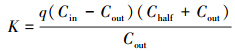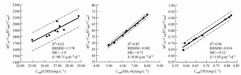 式中,K為最大面積去除率常數(g · m-2 · d-1),q 為水力負荷率(m · d-1),Cin為入流污染物濃度(mg · L-1),Cout為出水濃度(mg · L-1),Chalf為限制因素半飽和常數(mg · L-1)