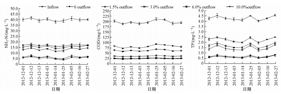 人工濕地系統穩定運行半年后,于2012年12月初(水溫的變化范圍為4~8 ℃.)開始投入低溫菌Pseudomonas flava WD-3,接種量V(菌液)/V(污水)為1.5%~10%,菌懸液的濃度為4.575×108個 · mL-1,水力停留時間為10 d,以未接菌的人工濕地為對照組.連續3個月內追蹤測定COD、NH3-N和TP的變化情況.