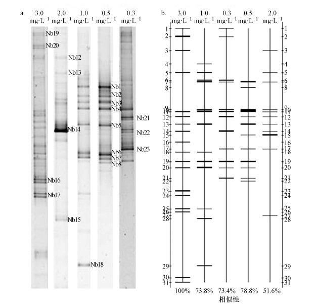 由圖 5a可知,Nitrobacter的群落結構隨DO的降低發生了明顯的變化,高DO環境(3和2 mg·L-1)的Nitrobacter群落與低DO環境(1、0.5和0.3 mg·L-1)的Nitrobacter群落結構存在較大的差異,DO為1和0.5 mg·L-1工況下Nitrobacter的群落結構最為相似,共同的優勢種群為條帶Nb1、Nb2、Nb3、Nb4、Nb5、Nb6、Nb7,Nb8則在DO為0.5 mg·L-1的環境下更為豐富,Nb18是DO為1 mg·L-1工況下存在的優勢條帶.當DO繼續降低至0.3 mg·L-1時,系統中的優勢種群轉變為Nb4、Nb21、Nb22、Nb23,系統中的優勢種群數量明顯降低.