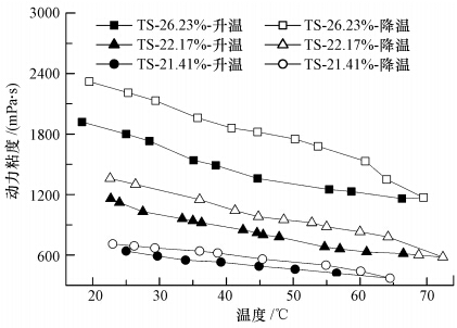 通過水浴加熱將污泥樣品從室溫20 ℃升至70 ℃,隨后自然降溫,粘度計選用3#轉子,固定剪切速率γ為41.8 s-1.取半連續式反應器內的消化污泥,TS分別為26.23%、22.17%、21.41%,測定不同溫度下的動力粘度,繪制粘溫曲線.