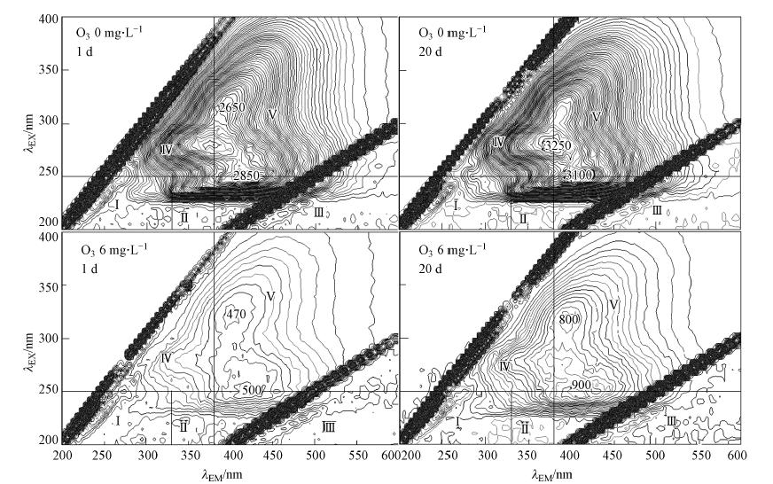 三維熒光光譜采用Hitachi F-4500熒光光度計測定.激發波長范圍為200~400 nm,發射波長范圍為 280~500 nm.間隔均為10 nm,掃描速度為12000 nm · min-1,帶通為10 nm.