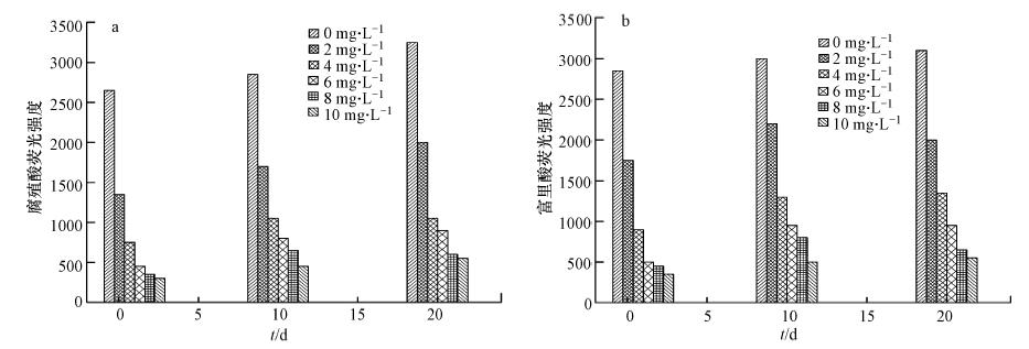 從圖 8a和b可以看出,腐殖酸與富里酸類物質的去除率隨著臭氧投加量的增加逐漸增大. 當臭氧投加量為10 mg · L-1時,腐殖酸類和富里酸類物質的去除率達到88.7%和87.7%.隨著時間的變化,不同臭氧投加量的水樣中兩種物質的熒光強度變化不大,只有小幅度的增加,可能是由于水樣中藻類的衰亡腐敗導致.