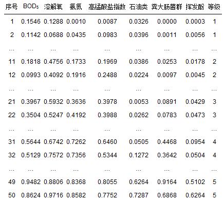 在上述各評價(jià)標(biāo)準(zhǔn)等級范圍內(nèi)按均勻分布隨機(jī)產(chǎn)生10個(gè)樣本,對于每個(gè)指標(biāo)采用同一組隨機(jī)數(shù)值,共形成50個(gè)評價(jià)樣本,將Ⅰ~Ⅳ類水體和Ⅴ類水體分別賦予經(jīng)驗(yàn)等級1~5共5個(gè)等級,結(jié)果如表 2所示.