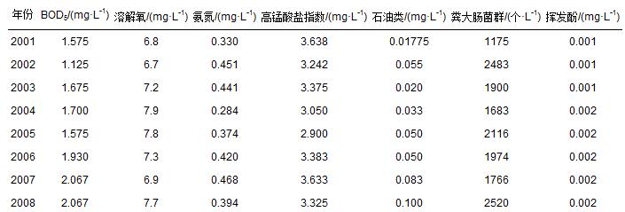 根據(jù)《地表水環(huán)境質(zhì)量標(biāo)準(zhǔn)》(GB3838—2002)和揚(yáng)州市江都環(huán)境監(jiān)測中心站的原始數(shù)據(jù),本文收集了南水北調(diào)揚(yáng)州江都芒稻河地區(qū)從2001—2008年比較完整的數(shù)據(jù):長江芒稻河二水廠斷面為BOD5、揮發(fā)酚、溶解氧、石油類、氨氮、高猛酸鹽指數(shù)、糞大腸菌群共7個(gè)水質(zhì)指標(biāo)的數(shù)據(jù),具體如表 3所示.