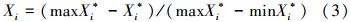 1)對數(shù)據(jù)進(jìn)行規(guī)范化處理,對于效益型指標(biāo)和成本型指標(biāo)分別按式(2)和(3)進(jìn)行計(jì)算,之后將指標(biāo)變換到[0,1]區(qū)間,即得到數(shù)據(jù)歸一化后的指標(biāo)數(shù)據(jù)向量如式(4)所示.