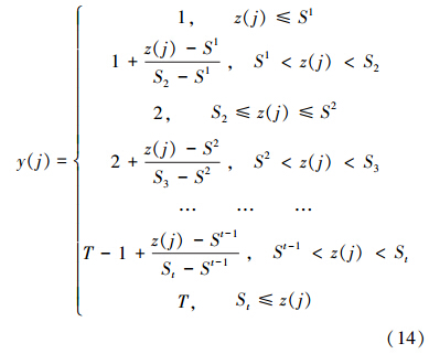4)對于T個(gè)評價(jià)等級,設(shè)第t個(gè)評價(jià)等級對應(yīng)的評價(jià)值z(j)∈[St,St],其中,St、St是根據(jù)國家《地表水環(huán)境質(zhì)量標(biāo)準(zhǔn)》(GB3838—2002)確定的5類水質(zhì)分類區(qū)間的上界和下界,根據(jù)第j個(gè)樣本計(jì)算的評價(jià)值z(j)與經(jīng)驗(yàn)等級y(j)(式(14)),建立z(j)-y(j)的散點(diǎn)圖,根據(jù)散點(diǎn)圖可建立相應(yīng)的分形插值評價(jià)模型(階梯函數(shù)).