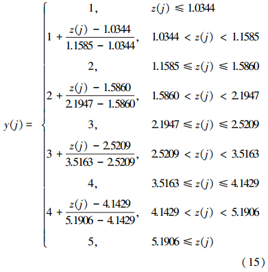 以經(jīng)驗(yàn)等級值為縱坐標(biāo),以綜合評價(jià)值為橫坐標(biāo),得到兩者的散點(diǎn)圖(圖 2).從圖 2可以看出,z(j)和y(j)的圖形為階梯形、上升曲線,根據(jù)公式(13)用a、b、c、d、e、f、g、h、k、l分段線性插值,得到水質(zhì)評價(jià)的分形插值等級模型(分段函數(shù)),具體見公式(15).