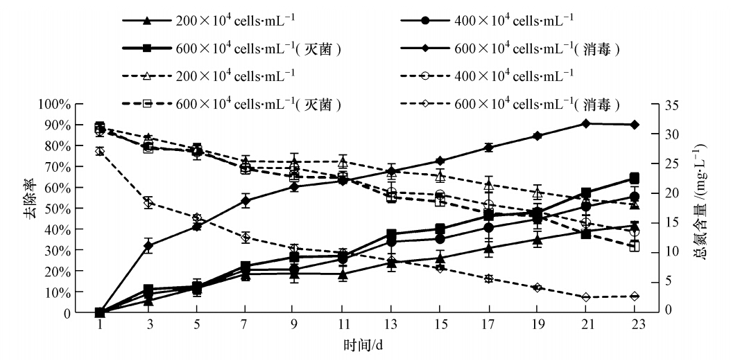 由圖 2可以看出,600×104 cells · mL-1(消毒)組狹形小樁藻對(duì)豬場(chǎng)養(yǎng)殖污水的總氮去除率最高,為90.05%,顯著高于其他各組(p<0.05),試驗(yàn)結(jié)束時(shí)水體總氮含量為2.69 mg · L-1.400×104 cells · mL-1組和600×104 cells · mL-1(滅菌)組的總氮去除率分別為55.54%和64.32%.200×104 cells · mL-1組的去除率為41.68%,試驗(yàn)結(jié)束時(shí)水體總氮含量為18.11 mg · L-1.可以看出,600×104 cells · mL-1(消毒)組狹形小樁藻對(duì)豬場(chǎng)養(yǎng)殖污水中的總氮去除效果最好.
