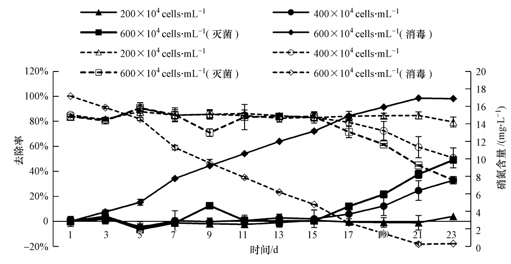 3種不同接種密度的狹形小樁藻對(duì)高壓滅菌污水的氨態(tài)氮去除率都較高,說明狹形小樁藻對(duì)豬場(chǎng)養(yǎng)殖污水的氨態(tài)氮有較好的利用率.Ip等研究表明氨氮濃度超過50 mg · L-1會(huì)抑制藻細(xì)胞的生長,本研究中氨氮濃度14 mg · L-1左右,沒有超過這個(gè)范圍,因此可以滿足藻細(xì)胞生長.經(jīng)過狹形小樁藻的處理,3組污水中的氨態(tài)氮濃度均降低到0.5 mg · L-1以下,達(dá)到了地表水環(huán)境質(zhì)量標(biāo)準(zhǔn)的Ⅱ類標(biāo)準(zhǔn)(GB3838—2002).從對(duì)氨態(tài)氮去除的時(shí)間來看,接種密度為600×104 cells · mL-1的藻細(xì)胞在第15天就將氨態(tài)氮降低到最低水平(0.34 mg · L-1),接種密度為400×104 cells · mL-1的藻細(xì)胞在第19天將氨態(tài)氮降低到較低水平(0.60 mg · L-1),說明了藻細(xì)胞接種密度越大,達(dá)到最大去除率的時(shí)間越短,進(jìn)而說明提高微藻接種密度可提高對(duì)污水的凈化效率.Lau等對(duì)不同接種濃度下小球藻對(duì)初級(jí)城市污水的處理結(jié)果也表明,高接種濃度能提高小球藻對(duì)污水的凈化速度.