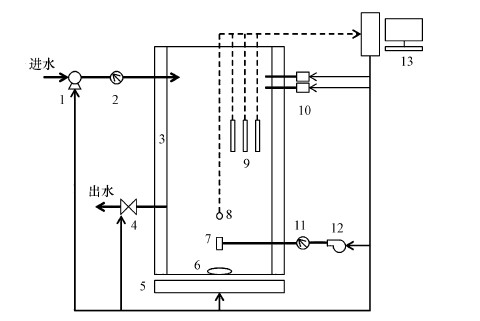 圖 1試驗SBR裝置示意圖(1.進(jìn)水泵; 2.進(jìn)水流量計; 3.水浴器; 4.電磁閥; 5.磁力攪拌器; 6.轉(zhuǎn)子; 7.曝氣頭; 8.壓力傳感器; 9.DO、PH、溫度探頭; 10.酸堿蠕動泵; 11.空氣流量計; 12.曝氣機(jī); 13.DAC系統(tǒng))
