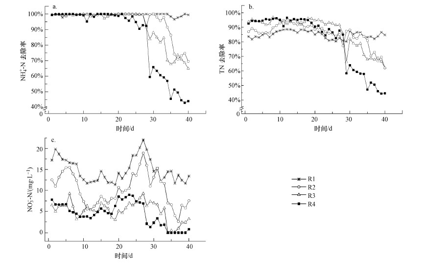圖 3鉻對SBR脫氮系統(tǒng)的影響(a.系統(tǒng)氨氮去除率,b.系統(tǒng)總氮去除率,c.系統(tǒng)出水硝酸鹽濃度)