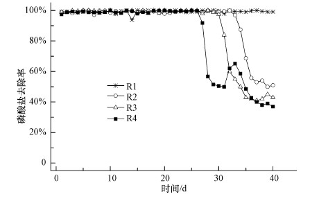 如圖 4所示,試驗前期磷酸鹽去除率穩(wěn)定保持在99%,隨著活性污泥中鉻漸漸地積累,R2、R3、R4系統(tǒng)在第34、31和27 d陸續(xù)出現(xiàn)了磷去除率下降現(xiàn)象,直至試驗結(jié)束,R2、R3和R4系統(tǒng)磷去除率分別下降至51%、43%和37%.活性污泥系統(tǒng)除磷過程主要依賴于聚磷菌的過量吸磷,研究發(fā)現(xiàn),當(dāng)EBPR系統(tǒng)中Cr(Ⅵ)高于0.3 mg·L-1時,其除磷性能逐漸喪失,聚磷菌占全菌的比例由84.26%下降至38.40%.本試驗中隨著鉻離子對SBR系統(tǒng)中活性污泥的不斷影響,系統(tǒng)內(nèi)鉻累積的量不斷增加,聚磷菌生長代謝過程受到了抑制,導(dǎo)致整個系統(tǒng)除磷效率降低.此外,比較R2和R3系統(tǒng),同樣可發(fā)現(xiàn)分段進(jìn)水工藝更早出現(xiàn)抑制現(xiàn)象,原因可能是分段進(jìn)水工藝(R3)相比傳統(tǒng)SBR工藝(R2)提供更多釋磷吸磷交替過程.比較R3和R4系統(tǒng),可見進(jìn)水鉻濃度越高,抑制現(xiàn)象越早出現(xiàn),即更易受到抑制影響.總之,在低濃度鉻條件下,SBR系統(tǒng)除磷過程受到了顯著的抑制影響.