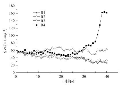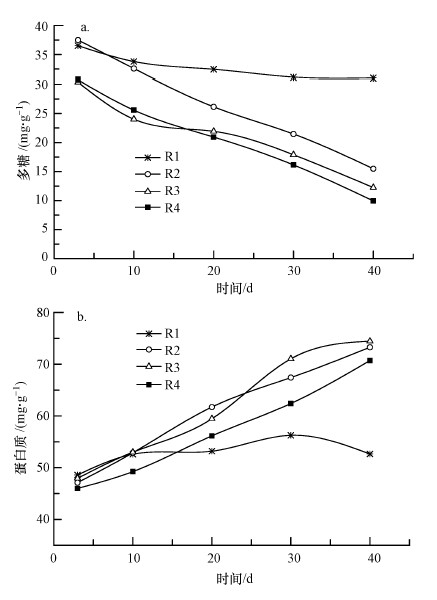 EPS在低濃度鉻的影響下也發(fā)生了較大的變化,R2、R3和R4系統(tǒng)多糖的分泌能力受到了抑制,最終的分泌量相比初始值分別下降了58.7%、59.6%和67.7%(圖 6a).與之相反,由于微生物可以通過促進(jìn)蛋白質(zhì)的分泌來抵御鉻的生物毒性,因此,試驗開始后出現(xiàn)了蛋白質(zhì)量上升的現(xiàn)象(圖 6b).由此可見,0.5 mg·L-1總鉻濃度對SBR系統(tǒng)的SVI值影響不大,但1 mg·L-1總鉻濃度則會引起污泥膨脹;而且低濃度鉻對細(xì)胞多糖的分泌功能有抑制作用,對細(xì)胞蛋白質(zhì)合成則有促進(jìn)作用.