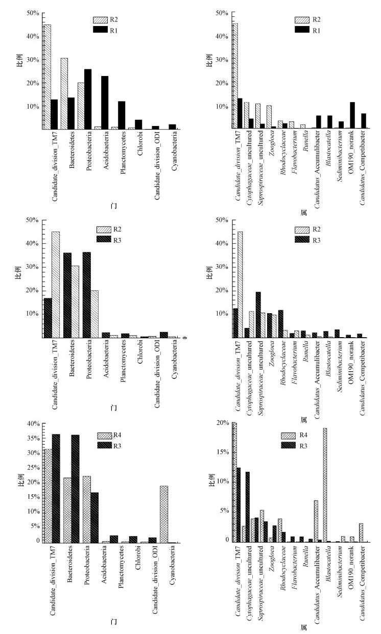 主要細(xì)菌群落變遷如圖 7所示.比較R1和R2系統(tǒng),可見在低濃度鉻的影響下,許多微生物的生長都受到了抑制,如在脫氮過程中起重要作用的Acidobacteria(由22.8%降至1.2%)、Planctomycetes(由12%降至1%)和Cyanobacteria(由2.2%降至0.03%),以及在除磷過程中起主導(dǎo)作用的Candidatus_Competibacter(由6.4%降至0.12%)和Candidatus_Accumulibacter(由5.5%降至0.25%)等,其在系統(tǒng)微生物群落中所占的比例出現(xiàn)大幅度下降,這也是試驗后期氨氮和磷酸鹽去除率下降的原因.另外,在強(qiáng)化生物除磷系統(tǒng)中經(jīng)常出現(xiàn)的Chlorobi也受到了明顯抑制(由4.1%降至0.7%).另一方面,低濃度鉻的條件也促進(jìn)了一些細(xì)菌的生長,導(dǎo)致其在群落中所占比例大大提升,如Candidate_division_TM7(由13%增至45%)、Bacteroidetes(由13%增至30%)和Zoogloea(由0.8%增至8.8%)等.通過比較R2和R3系統(tǒng)可知,在低濃度鉻條件下,SBR傳統(tǒng)A/O工藝和分段進(jìn)水工藝中微生物群落的變化存在差異.Proteobacteria和Thauera作為主要的反硝化細(xì)菌,其在R3中所占比例(分別為36%和3%)顯著大于R2中所占比例(分別20%和1.1%),從微觀角度證明了分段進(jìn)水工藝有利于反硝化菌的生長,從而提高了SBR的反硝化效率.同時,分段進(jìn)水也更有利于某些其他重要菌種的生長,如Rhodocyclaceae(R2:3.2%;R3:11.7%)、Terrimonas(R2:0.4%;R3:2.8%)、Azospira(R2:0.2%;R3:3.5%)和Dechloromonas(R2:0.16%;R3:1.7%)等;比較R3和R4系統(tǒng)可知,在進(jìn)水鉻濃度增大至1 mg·L-1時,Bacteroidetes(R3:36%;R4:22%)、Acidobacteria(R3:2.3%;R4:0.5%)、Planctomycetes(R3:1.8%;R4:0.4%)、Rhodocyclaceae(R3:11.7%;R4:2.7%)、Nitrospira(R3:0.5%;R4:0.07%)等微生物群落比例都出現(xiàn)了顯著的下降.相比其他系統(tǒng),R4中出現(xiàn)了一種新的微生物群落—BD1-5,并且占據(jù)較大比例(19%),關(guān)于BD1-5出現(xiàn)在活性污泥中的報道較少,根據(jù)R4在第40 d時出現(xiàn)了污泥膨脹現(xiàn)象推測BD1-5有可能是一種絲狀菌.總之,從微生物群落變遷的結(jié)果可得,低濃度鉻對SBR活性污泥系統(tǒng)微生物群落有一定影響,特別是抑制了許多脫氮除磷功能菌的生長,導(dǎo)致了宏觀指標(biāo)去除率下降的現(xiàn)象.具體參見污水寶商城資料或http://www.bnynw.com更多相關(guān)技術(shù)文檔。