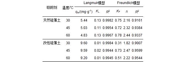 表 1 天然和改性硅藻土吸附Cd2+的Langmuir與Freundlich等溫吸附模型參數