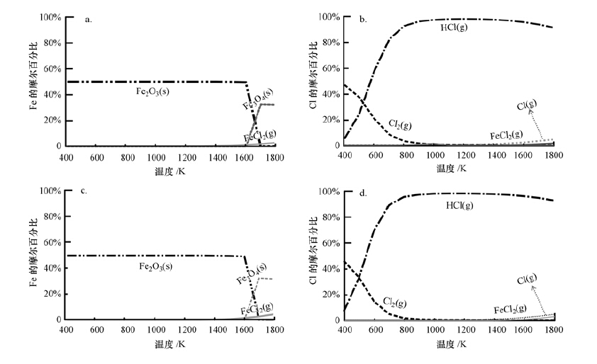 焚燒過程中Cl的分布見圖 4d~圖 4f,在整個焚燒溫度區間,Cl主要以CaCl2(s)、CaO(CaCl2)4(s)、HCl(g)、Cl(g)及CaCl2(g)形式存在.當加入5%FeCl3后,400~1000 K范圍內Cl主要以CaCl2(s)存在,并且隨著溫度的升高,CaCl2(s)逐漸分解向HCl(g)轉化;當溫度高于950 K時,Cl主要以HCl(g)和CaO(CaCl2)4(s)形式存在,其中,CaO(CaCl2)4(s)主要在900~1200 K范圍內存在,其他大都以HCl(g)存在;當溫度高于1400 K時,開始有CaCl2及Cl氣體產生.隨著FeCl3添加量的增大,還可以發現:1在溫度1000~1400 K范圍內,CaO(CaCl2)4(s)產生比例越來越小;2在1300~1800 K范圍,Cl(g)及CaCl2(g)的生產比例有所增加.