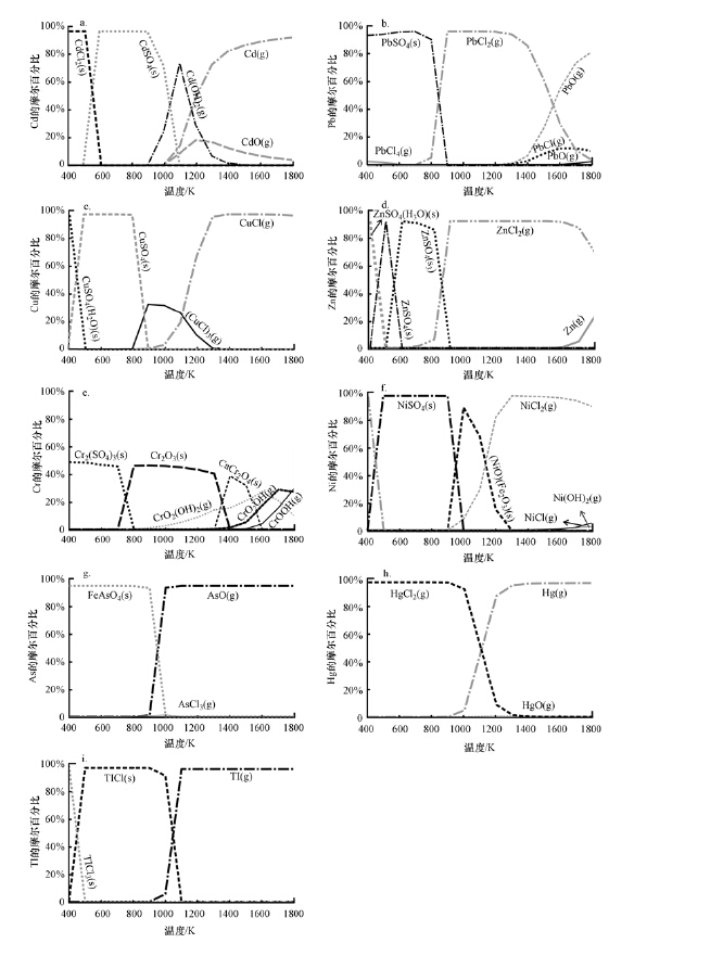 Cd在低溫區主要以CdCl2(s)形式存在,在500~1000 K內生成了CdSO4(s)取代了圖 6中的CdO(s)及圖 7中的CdCl2(s),并且S的存在導致Cd(OH)2(g)的存在溫度區間變小(圖 8a).Pb在400~9000 K范圍內主要以PbSO4(s)形式存在,抑制了PbCl2(g)的生成溫度(降低約400 K)(圖 8b).對于Cu來講,低溫區有S存在情況下,Cu易于形成CuSO4(H2O)(s),在500~900 K范圍內生成CuSO4(s)取代了CuO(s)(圖 8c).Zn和Cu的分布具有相似性,低溫區有S存在情況下,Zn易于形成ZnSO4(H2O)(s),在500~950 K范圍內生成ZnSO4(s)取代了ZnO(s)(圖 8d).Cr在400~750 K范圍內有Cr2(SO4)3(s)生成,在1300~1600 K范圍內有CaCr2O4(s)生成,減小了Cr在此溫度下的揮發性(圖 8e).Ni在400~900 K范圍內也是以硫酸鹽形式存在,減小了Fe2O3(s)對Ni的影響(圖 8f).在400~950 K范圍,As可以與Fe結合生成FeAsO3(s),同時降低了AsO(g)的生成溫度(約300 K)(圖 8g).揮發性元素Hg和Tl不受硫化物的影響,對照圖 6和圖 7,其基本保持不變(圖 8h、i).