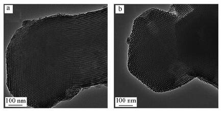 圖 3是合成介孔材料A-SBA-15和AN-SBA-15的TEM圖像.從圖中可以看出A-SBA-15和AN-SBA-15的TEM圖像,在垂直于孔軸方向,呈現出了二維六方介孔結構,這與SAXRD的結果是一致的,表明合成的硅基介孔材料具備穩定的骨架結構,在改性過程中不易被破壞,仍保持有序的結構,為制備雙功能吸附材料提供優良的載體.
