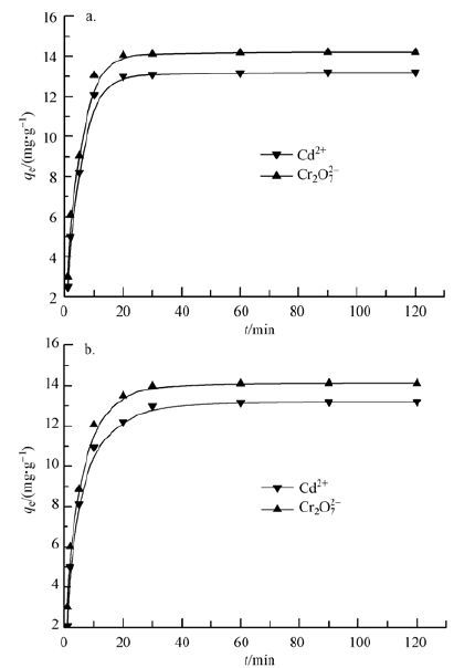 圖 7a是AN-SBA-15吸附Cd2+和Cr2O72-的吸附量隨時間的變化曲線圖.Cd2+和Cr2O72-的濃度都為10 g·L-1,吸附劑用量為0.03 g,pH為5.0,吸附溫度為25 ℃.從圖中可以看出,AN-SBA-15對Cd2+和Cr2O72-的吸附趨勢大體一致.在20 min內,Cd2+和Cr2O72-的吸附量迅速提高,隨著吸附時間的繼續增加,吸附量緩慢提高.當吸附時間為40 min時,吸附量基本不變,因此,Cd2+和Cr2O72-的吸附平衡在60 min內就達到了.