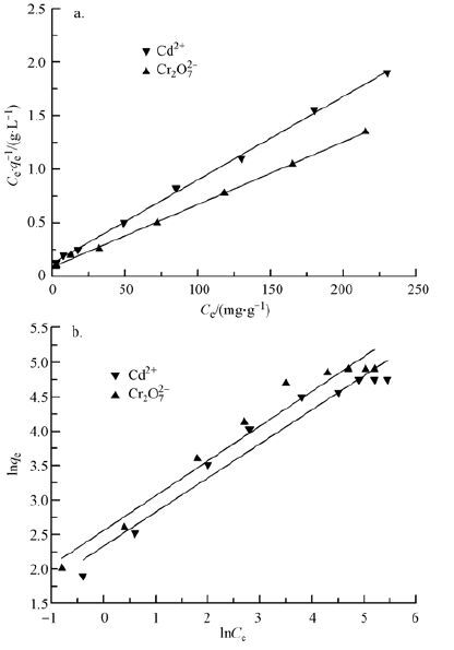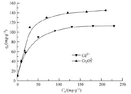 圖 8是AN-SBA-15吸附Cd2+和Cr2O72-的的吸附等溫曲線.吸附劑用量為0.03 g,pH為5.0,吸附時間為120 min,吸附溫度為25 ℃,Cd2+和Cr2O72-的濃度分別都為10-300 mg·L-1.從圖 8可以看出,隨著離子濃度的增大,平衡吸附量增大,但其提高幅度逐漸減弱,最終趨于飽和,達到平衡.
