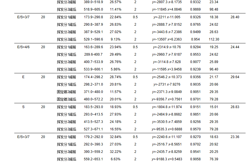 各階段擬合方程的可決系數(shù)在0.9035~0.9986之間, 線性關(guān)系比較好, 說明最終確定的各個試樣的反應(yīng)級數(shù)比較合理, 動力學(xué)參數(shù)的求解結(jié)果見表 5.由表 5可知, 試樣在燃燒峰前的活化能通常比燃燒峰后的活化能小, 燃燒反應(yīng)峰前通常是反應(yīng)由難變易的過程, 而峰后則是反應(yīng)由易變難的過程.同時低溫段的活化能也比高溫段的活化能小, 這與固定碳在高溫不易燃燒結(jié)果是一致的.