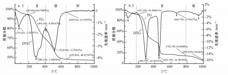 圖 1 試樣單獨燃燒的TG-DTG曲線(a.污泥; b.水葫蘆; TG曲線中,括號中第一個數(shù)據(jù)代表溫度(℃), 第2個數(shù)據(jù)代表殘余質(zhì)量分?jǐn)?shù);DTG曲線中,括號中第一個數(shù)據(jù)代表溫度(℃),第2個數(shù)據(jù)代表失重速率(min-1))