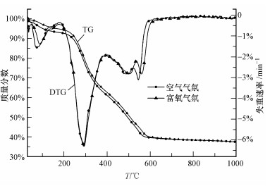 圖 4 混合試樣分別在空氣和富氧氣氛下TG-DTG曲線