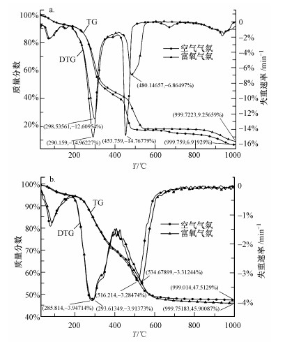 圖 3 水葫蘆(a)和污泥(b)分別在空氣和富氧氣氛下的TG-DTG曲線(TG曲線中,括號中第一個數(shù)據(jù)代表溫度(℃), 第2個數(shù)據(jù)代表殘余質(zhì)量分?jǐn)?shù);DTG曲線中,括號中第一個數(shù)據(jù)代表溫度(℃),第2個數(shù)據(jù)代表失重速率)