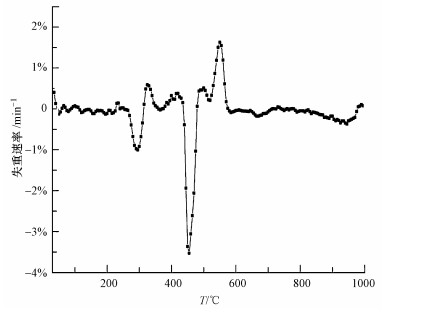 圖 1b為水葫蘆在空氣氣氛、20℃·min-1升溫速率下的TG-DTG曲線.由圖 1b可知, 水葫蘆的燃燒可分為3個階段:第Ⅰ階段( & 180℃)為水分析出階段, 失重率(8.22%)與工業(yè)分析數(shù)據(jù)相當(dāng);第Ⅱ階段(180~730℃)為有機質(zhì)燃燒階段, 主要是大量半纖維素、纖維素(200~430℃左右)和木質(zhì)素(>430℃)等有機物熱分解生成揮發(fā)性物質(zhì)和碳, 此階段TG曲線急劇下降, 其中, DTG曲線于290.3℃時出現(xiàn)最大峰, 失重率約為77.78%, 與揮發(fā)分與固定碳的含量之和(84.01%)相對應(yīng);第Ⅲ階段(>800℃)為木質(zhì)素等殘留物質(zhì)的燃燒和分解, 失重率約為8%.在DTG曲線中, 第Ⅱ階段存在3個失重峰, 其中, 第一個明顯的失重峰, 代表主揮發(fā)分的析出燃燒(290℃), 第二個失重峰為固定碳燃燒(453℃), 最后一個小峰則可能是少量鹽類的分解(700℃).上述曲線與閔凡飛等的研究結(jié)果一致.