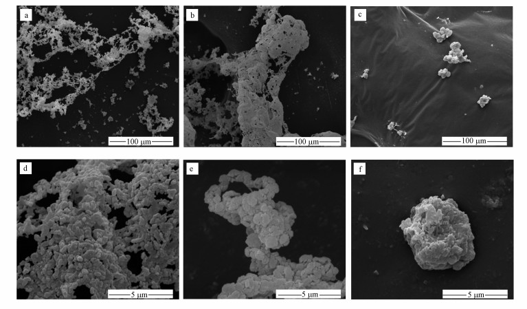 圖 5液相中單質硫掃描電鏡照片(a、b、c分別表示反應5 s、3 min、10 min, ×1000; d、e、f分別表示反應5 s、3 min、10 min, ×20000)