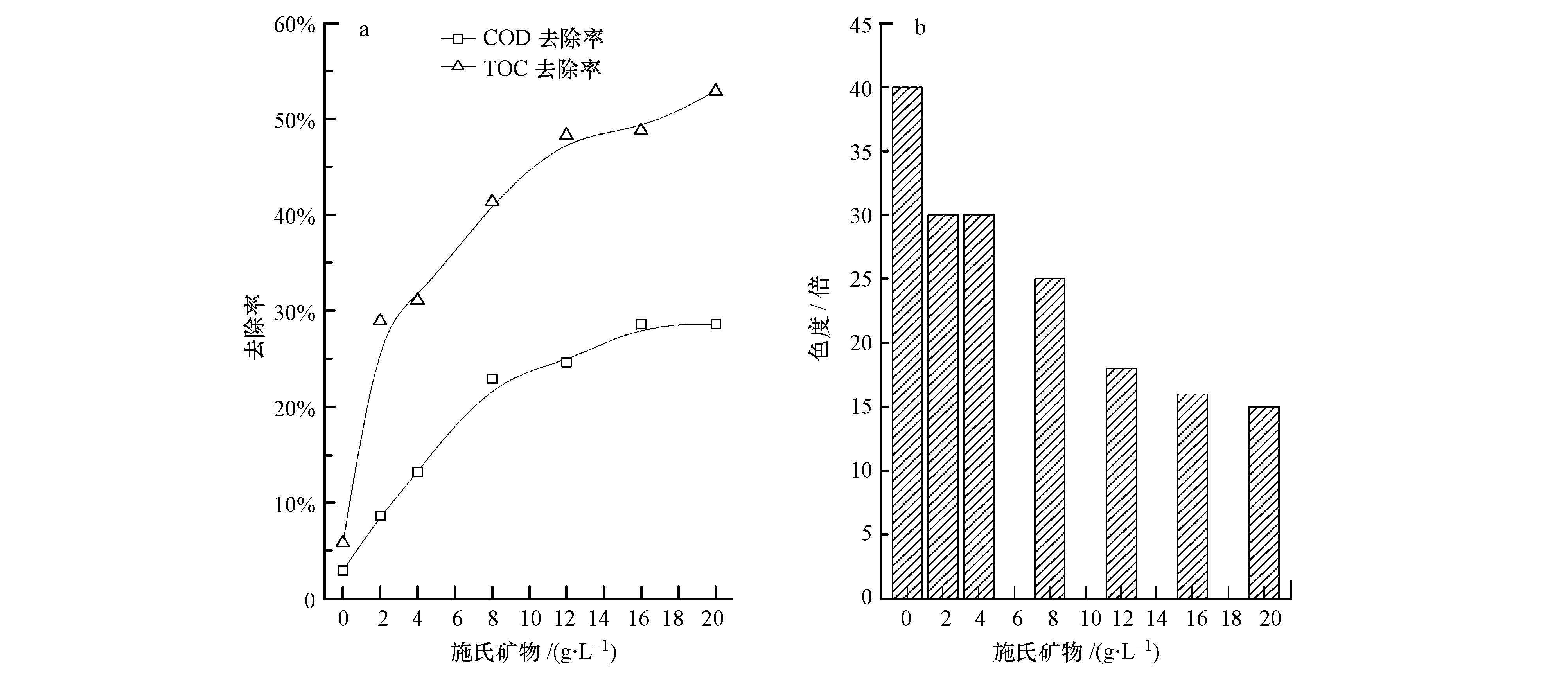 圖 5為施氏礦物添加量對滲濾液中污染物去除效果的影響.由圖 5a易知,COD和TOC去除率隨施氏礦物添加量的增加而逐漸提高,在m(施氏礦物)=20 g·L-1時,分別達到28.6%和52.9%;受Fe3+影響,色度去除效果低于ZnO、TiO2、K2S2O8光催化的去除效果,最低出水色度為15倍(圖 5b).