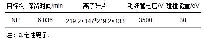 質譜檢測器采用電噴霧離子化源(ESI),負離子方式檢測;離子噴射電壓3500 V;溫度300 ℃;源內氣體 1(GS1,N2),壓力45×6.894×103 Pa;氣體2(GS2,N2),壓力45×6.894×103 Pa;干燥氣10 L·min-1,霧化器 13.79×105 Pa;掃描方式為多重反應監測(MRM),具體參數見表 3.