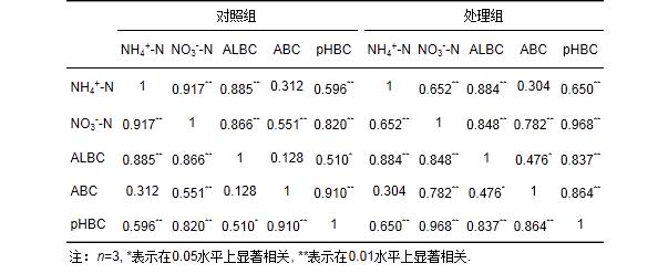 表 1 對(duì)照組和蚯蚓處理組NH4+-N、NO3--N、ALBC、ABC、pHBC相關(guān)矩陣