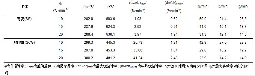 表 2 不同升溫速率下污泥和咖啡渣的燃燒特征特性參數