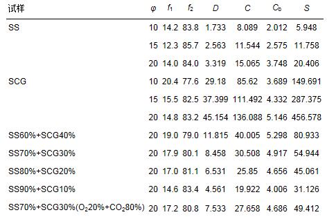 由表 4可知, 以升溫速率20 ℃·min-1為例, 單一污泥試樣的綜合燃燒特性指數S為20.406×10-11 mg2·min-2·K-3, 比咖啡渣的S值低了一個數量級.升溫速率由10 ℃·min-1提高到20 ℃·min-1, 污泥的S值由5.948×10-11 mg2·min-2·K-3增加到20.406×10-11 mg2·min-2·K-3, 咖啡渣的S值由149.691×10-11 mg2·min-2·K-3增加到456.578×10-11 mg·min-1·K-3, 說明試樣在較高的升溫速率下具有良好的綜合燃燒特性.污泥與咖啡渣混燒時, 混合試樣的S值隨著咖啡渣摻燒比例的增加而增大.因此, 咖啡渣的加入改善了污泥的燃燒性能, 且混合樣的燃燒特性隨著咖啡渣混合比的增加而變佳.在O2/CO2氣氛下燃燒時的S值比在空氣氣氛(O2/N2)時小5.532×10-11 mg2·min-2·K-3, 說明O2/CO2氣氛抑制混合試樣的燃燒.