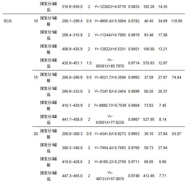 在試樣的燃燒過程中, 揮發(fā)分的析出直接影響試樣的著火溫度, 所以, 本文通過計算揮發(fā)分釋放特性指數D對試樣燃燒過程中揮發(fā)分的析出情況進行分析.其表達式見方程(1), 數據計算結果見表 4.