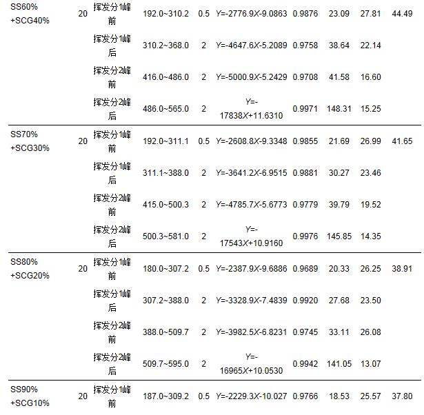 根據表 3可知, 污泥中摻燒咖啡渣時, 混合試樣的著火溫度隨著咖啡渣摻燒比例的增加而增加, 以摻燒比為40%為例, 分別比30%、20%、10%升高了9.1、17.0、29.0 ℃, 比單一污泥樣升高35 ℃, 這是由于污泥中的可燃基揮發(fā)性組分與咖啡渣中的揮發(fā)分成分有所不同, 污泥中揮發(fā)分與咖啡渣中揮發(fā)分相比, 能在更低的溫度下著火燃燒.當咖啡渣摻燒比為10%、20%、30%、40%時, 對應的燃盡溫度分別為612.9、593.0、587.3、570.0 ℃, 混合試樣的燃盡溫度比單一污泥樣大、比單一咖啡渣試樣小, 且咖啡渣摻燒比由10%增加到40%時, 混合物的燃盡時間由30.5 min縮短到28.3 min, 小于單一污泥樣的燃盡時間, 表明在污泥中添加咖啡渣有利于改善污泥的燃盡性能.