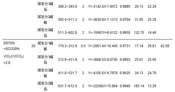 從表 4可以看出, 單一污泥和咖啡渣試樣的燃盡指數Cb都隨著升溫速率的增加而增大, 表明適當升溫有利于試樣的燃盡, 改善燃料的燃盡性能.當污泥和咖啡渣混燒時, 隨著咖啡渣摻燒比例的增加, 混合試樣的Cb值呈上升的趨勢.升溫速率同為20 ℃·min-1時, 污泥和咖啡渣的Cb值分別為3.748×10-3 min-1和5.146×10-3 min-1, 而當咖啡渣混合比例為40%時, 混合試樣的Cb值為5.298×10-3 min-1, 其數值并不是兩者Cb值的簡單疊加, 且高于污泥和咖啡渣單一試樣的Cb值, 說明污泥與咖啡渣混燃時存在協(xié)同作用, 這可能與污泥和咖啡渣本身成分之間的耦合及污泥中堿土金屬的催化作用有關.另外, 混合試樣在O2/CO2氣氛中燃燒時的Cb值小于在O2/N2氣氛中, 說明O2/CO2氣氛不利于燃料的燃盡.
