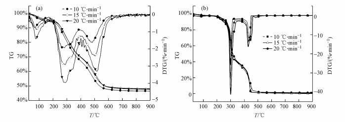樣品研磨至粒度小于200目, 然后按照要求進行充分混合.實驗溫度范圍為25~1000 ℃, 以3種升溫速率(10、15、20 ℃·min-1)進行升溫, 燃燒氣氛為空氣氣氛及富氧氣氛(V(O2):V(N2)=2:8), 載氣流量為50 mL·min-1.每次取試樣質量為(10±0.5)mg.為了減小實驗誤差, 每次熱重實驗都需扣除空白影響, 并在同批次樣品中抽取1個樣品進行3次重復實驗以進行數據監(jiān)控.