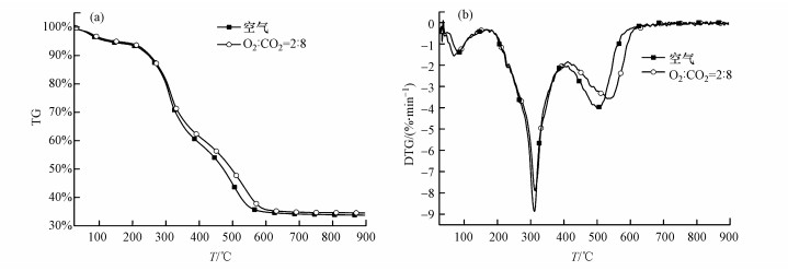熱重實驗裝置采用德國生產的熱綜合分析儀(NETZSCH Simultaneous Thermal Analyzer STA 409PC Luxx), 可獲得試樣的TG及DTG曲線, 其主要技術指標如下:測量溫度范圍為室溫至1400 ℃; 最大試樣量:1000 mg;熱天平精度為1 μg; 升溫速率為0~20 ℃·min-1; 實驗氣氛為空氣、富氧氣氛(VO2:VCO2=2:8).