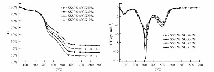 3.1.3 污泥與咖啡渣混合樣品的熱重曲線分析