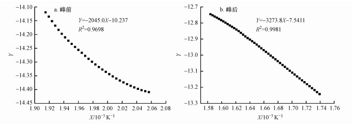 , 則有Y=a+bX, 由上式作圖求出該直線的斜率, 進而通過斜率可求出活化能E, 截距中包含頻率因子A.