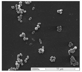 經過多次傳代馴化、反復平板涂布, 分離純化得到一株能夠有效脫色ASA-2的菌株, 命名為GF3.固體培養基上, 菌株GF3形成的菌落較小, 邊緣整齊, 呈圓形、淡紅色.掃描電鏡觀察結果如圖 1所示, GF3為球狀或短桿狀、無鞭毛, 大小約6~12 μm.該菌株對ASA-2有很強的脫色能力, 隨著培養時間的延長, ASA-2原有的紅色逐漸褪去, 最后完全消失.