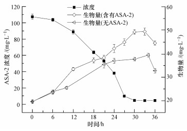 最適條件下, 將菌株GF3接入含有100 mg·L-1的ASA-2的無機鹽培養基中, 定時取樣, 測定不同時刻生物量和ASA-2濃度, 并進行紫外-可見波譜掃描.同時, 取100 mg·L-1 ASA-2降解過程中樣品, 在10000 r·min-1, 4 ℃下離心(AvantiTM J-30 I, Beckman, USA)分離10 min, 取上清液過0.22 μm濾膜, 進行TOC(Multi N/C 2100S, Germany Jena)和高效液相色譜-質譜分析(HP1100 LC/MSD, Agilent, USA).